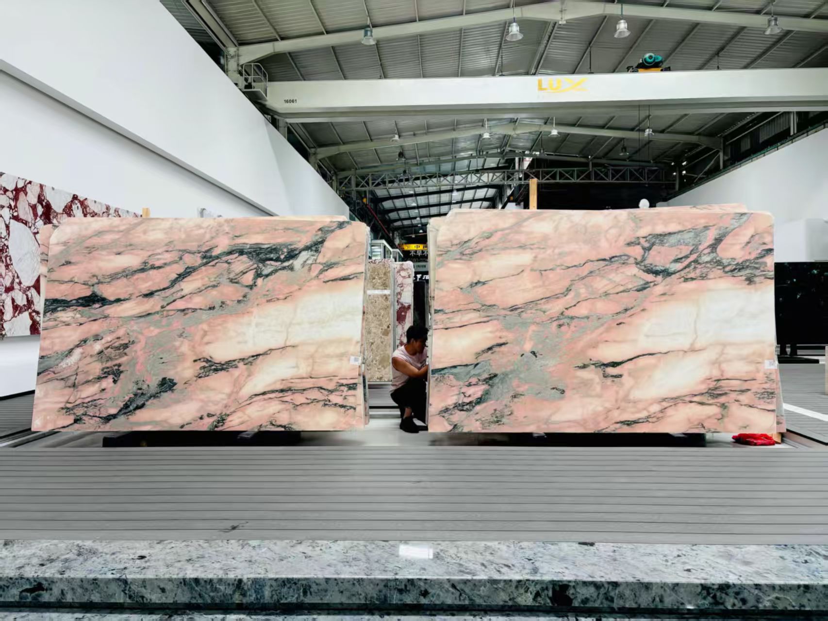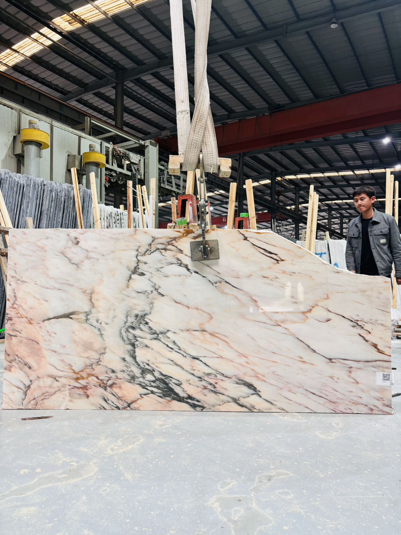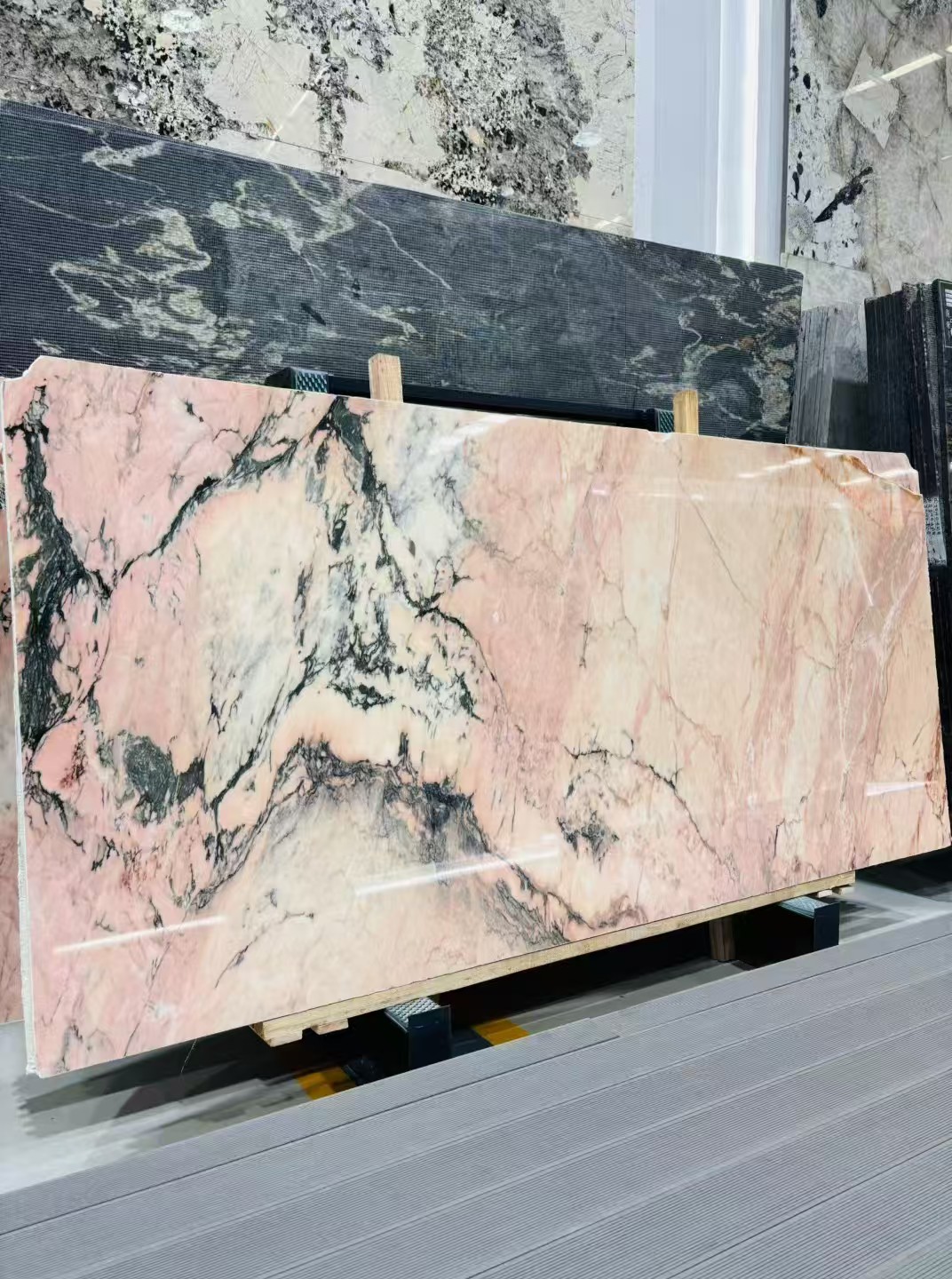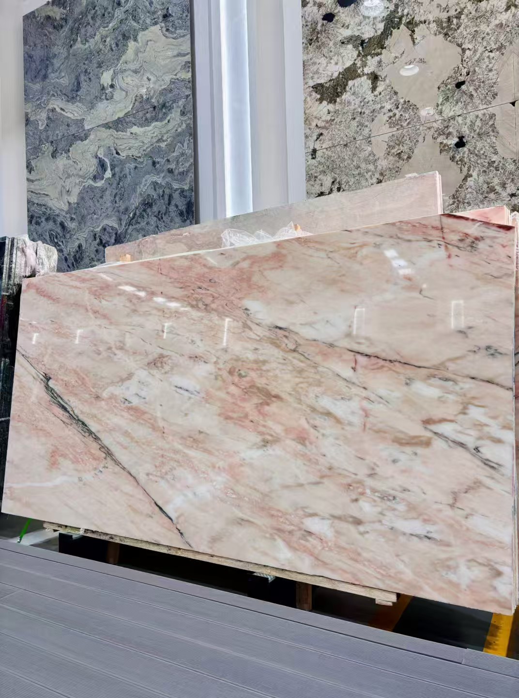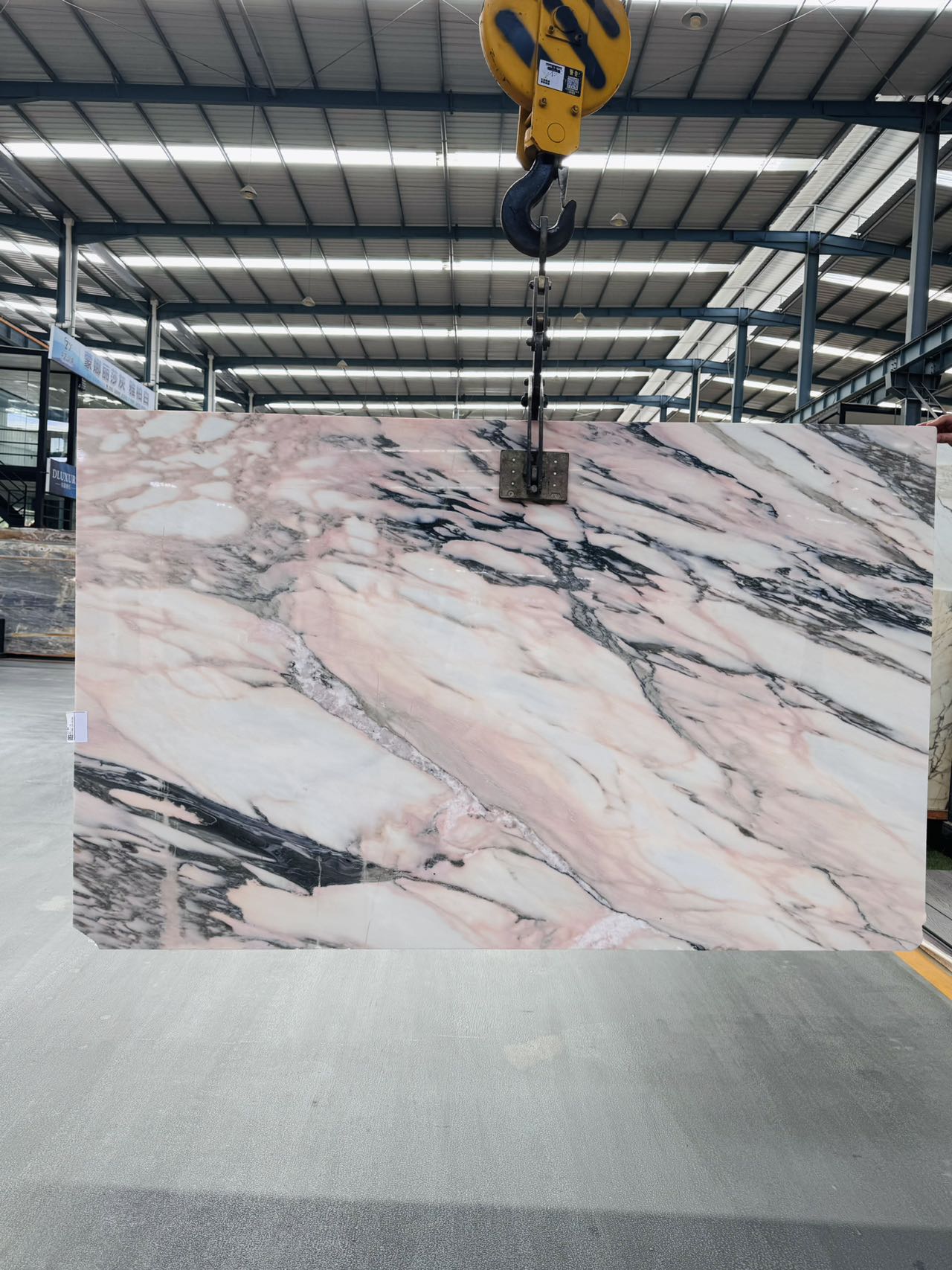 Portuguese Calacatta Viola Oro Rosa Marble is commonly used for walls and floors in indoor living rooms and bathrooms, creating a warm and elegant atmosphere. It can be processed into marble kitchen countertops, marble bathroom vanities, various furniture countertops and facades. It can also be used as a dry-hanging stone for building exteriors. For artistic decoration, it can be used for carvings, sculpted surfaces, bar counters, service counters, etc., enhancing the artistic feel of the space. It is durable, has a long service life, good physical stability, high rigidity, is not easily deformed, has good wear resistance, and a high modulus of elasticity.